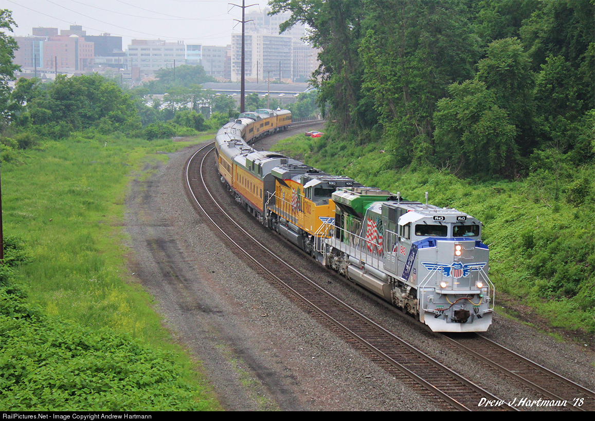 | NS 066, Union Pacific Business train, heads east through Harrisburg on the Norfolk Southern Harrisburg Line. 1943 had its CNW style cab signals removed and CR style signals installed for the trip over NS. |