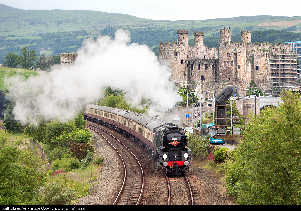 Ex-Southern Railway Battle of Britain class no. 34052 Lord Dowding passes Conwy Castle, in North Wales, heading for Llandudno Junction on a main line railtour on 2nd June 2018. The loco was named after Air Chief Marshal Hugh Caswall Tremenheere Dowding, 1st Baron Dowding, GCB, GCVO, CMG (24 April 1882 – 15 February 1970). He was Air Officer Commanding RAF Fighter Command during the Battle of Britain and is generally credited with playing a crucial role in Britain's defence, and hence, the defeat of Adolf Hitler's plan to invade Britain. The engine is actually West Country class no 34046 Braunton in disguise, but temporarily carrying the name and number of 34052 to commemorate the 75th Anniversary of the Battle of Britain. The West Country class and the Battle of Britain class were identical and numbered over a hundred locomotives built originally for the Southern Railway and latterly British Railways. Originally built with "Air-smoothed" casing, most of the classes were rebuilt in the 1950s into this form.