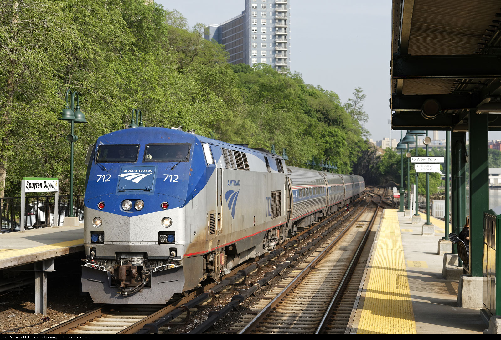 | Amtrak Empire Service train 237, passing the Spuyten Duyvil station, on Metro North's Hudson Line. |