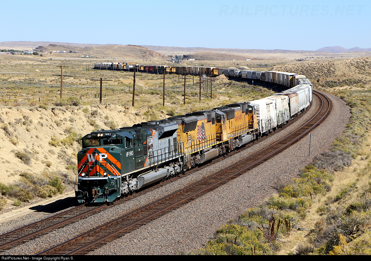 Looking sharp following display at North Platte, Nebraska's rail fest event UP 1983, Western Pacific heritage, leads westbound tonnage out of Rawlins, WY and towards the continental divide.