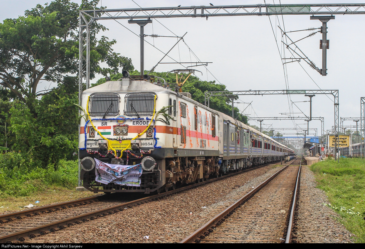 | Decorated ERODE WAP 7 leads the inaugural run of Kochuveli-Mangalore Jn Antyodaya express.This antyodaya rake has a unique silver paint scheme compared to the regular paint scheme of red and orange. |