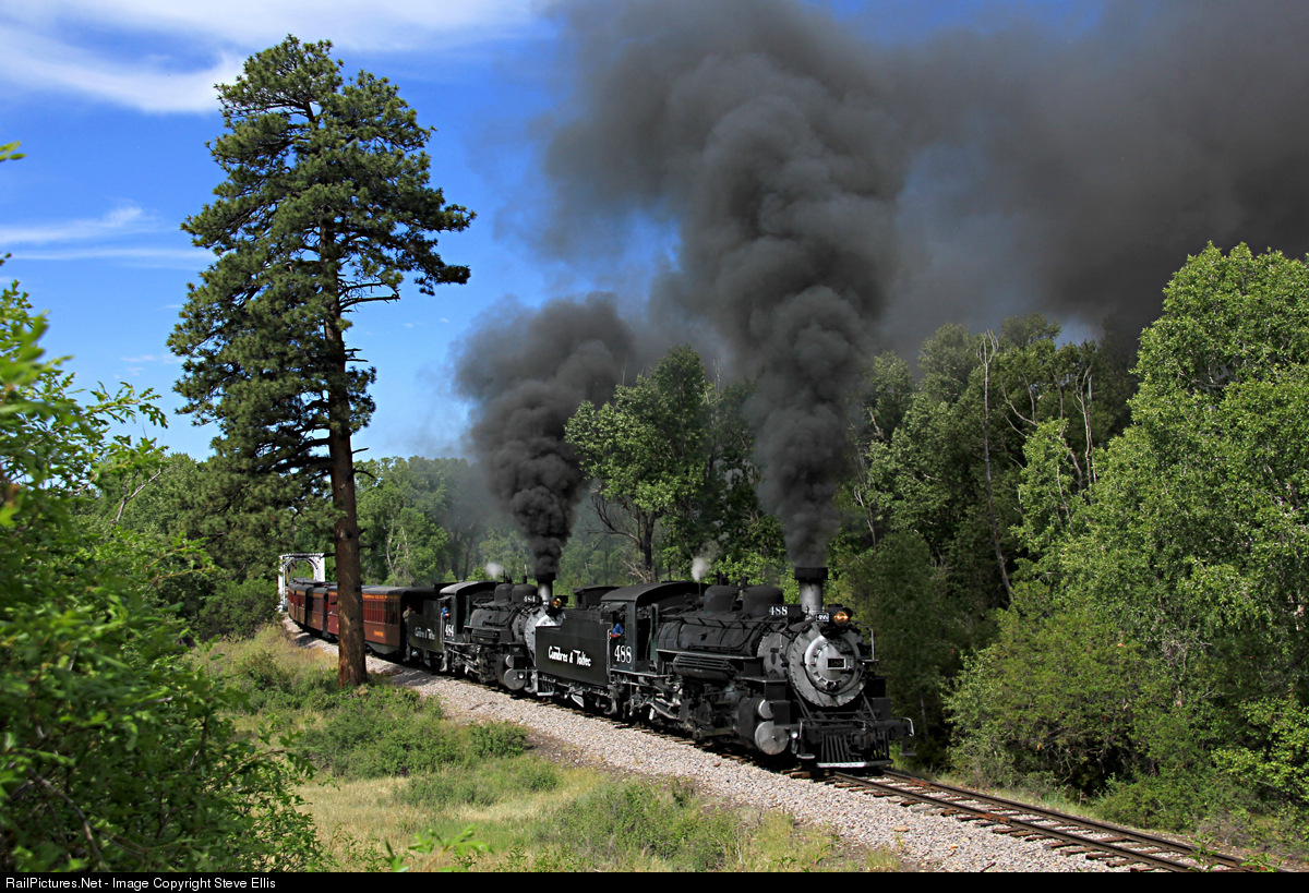 | With the fires above Durango that has shut down the Durango and Silverton. The Cumbres and Toltec is being watched closely and evaluated. On Thursday the Cumbres and Toltec ran a double header out of Chama, with 488, 484 to evaluate if they can reduce the fire danger by the locomotives not work as hard. Another possibility for the need for the double header is that business is increasing with the Durango and Silverton shut down. Thursday train was nine cars compared too the standard of seven the previous days. |