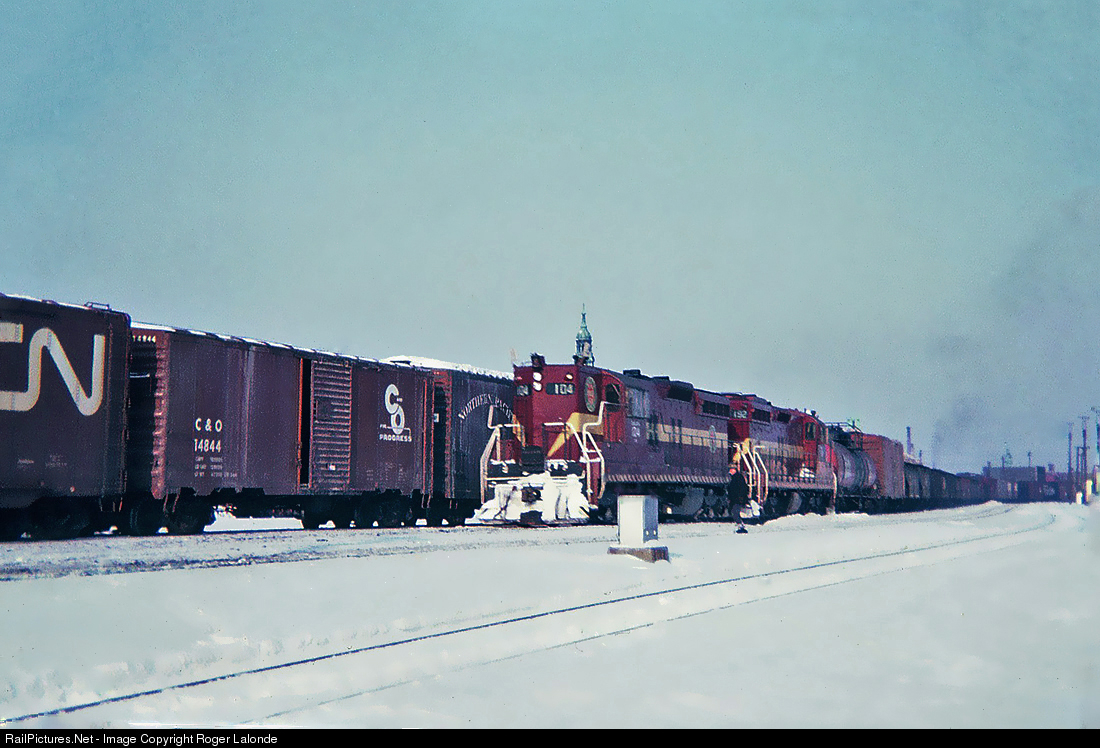 Two leased Duluth, Missabe & Iron Range SD9's that worked both CN and CP during the mid-60's. Number 104 and 152 westbound at Montreal, Quebec in February 1965.