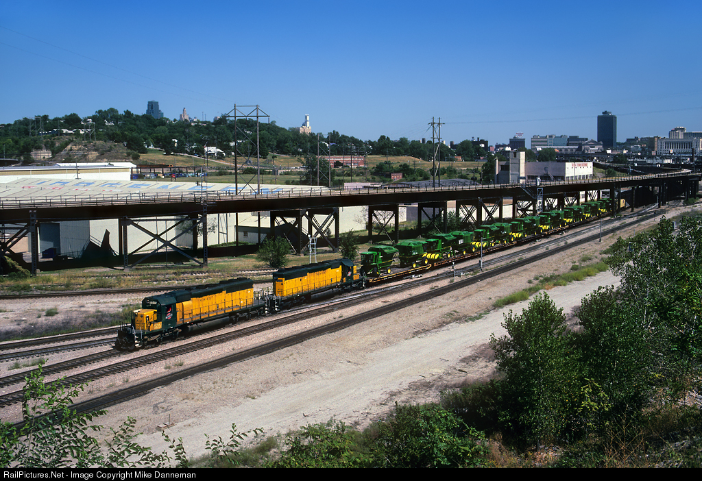 A Chicago & North Western freight approaches Santa Fe Junction near the state line at Kansas City, Missouri, on September 15, 1990. C&NW EMD SD40-2 Nos. 6845 and 6908 power the westbound train that has a eight-car cut of flatcars loaded with brand new John Deere farm equipment up front. The bridge above the train is the “high line” approach for Kansas City Terminal’s Kaw River Bridge.