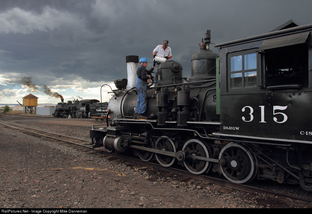 With thunderstorms rolling past to the northwest, the crew of Denver & Rio Grande Western C-18 No. 315 loads bags of sand in the sand dome, while in the background, Cumbres & Toltec Scenic Railroad train No. 216 with K-36 No. 484 has just arrived at the station at Antonito, Colorado, on the afternoon of June 4, 2018. The consolidation will make a run over Cumbres Pass to Chama, New Mexico, the next day hauling several freight cars to Chama yard.