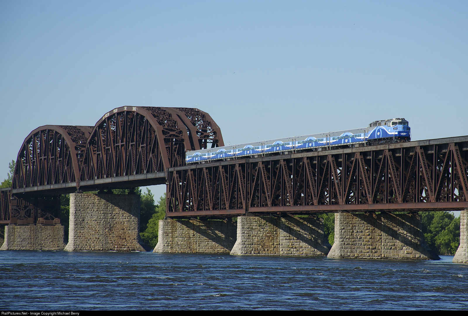 AMT 1347 has six Comet cars in a matching paint scheme as it crosses CP's bridge over the St. Lawrence River on its way to Montreal.