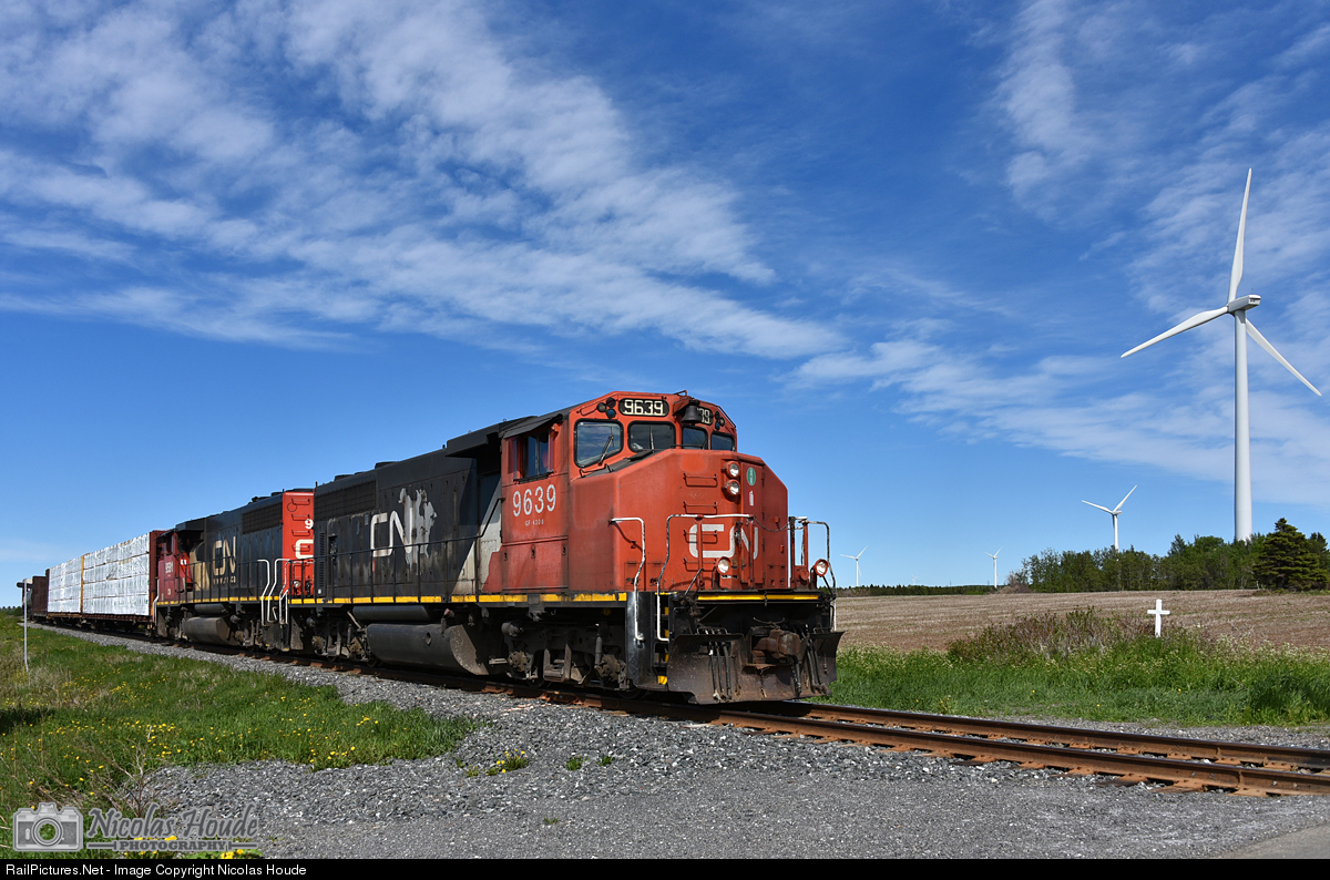 | After finishing its work at Matane, CN 561 is crossing the windmill park at Baie-des-Sables en route to Mont-Joli, QC. |
