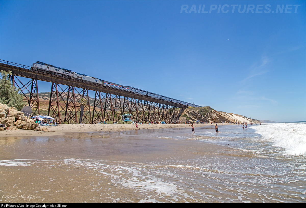 Beach-goers enjoying their Sunday afternoon at Gaviota pause for a moment to watch the passage of Amtrak's northbound Coast Starlight as it rumbles across the iconic trestle here.