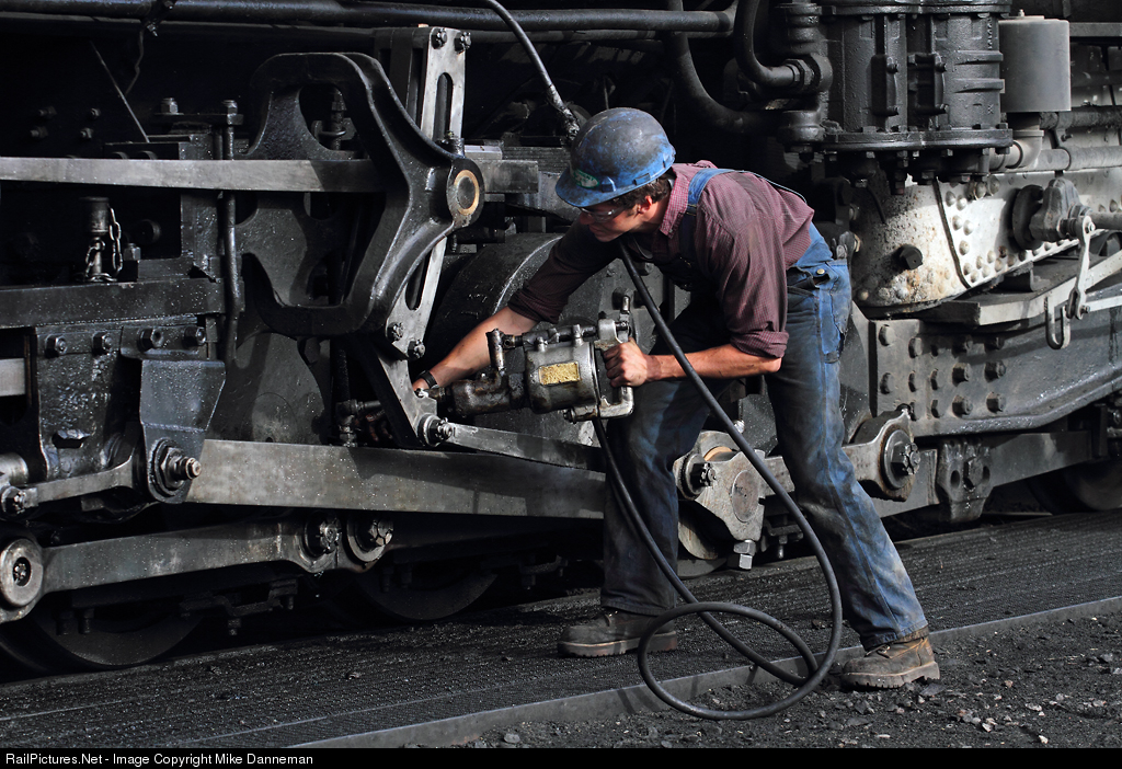 An afternoon hostler lubes the running gear of Cumbres & Toltec Scenic Railroad 2-8-2 K-36 No. 484 just outside the railroad’s enginehouse in Chama, New Mexico, on June 5, 2018.