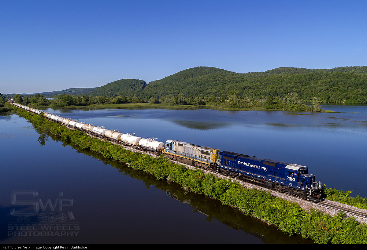 The Pan Am Southern Bellows Falls, VT to Portland, ME limestone slurry train BFPO-16, heads east on the Vermont Rail System GMRC Bellows Falls Subdivision with MEC C40-8s 7552 and 7500. Train is seen along the Connecticut River along Webb Pond in Rockingham, VT.