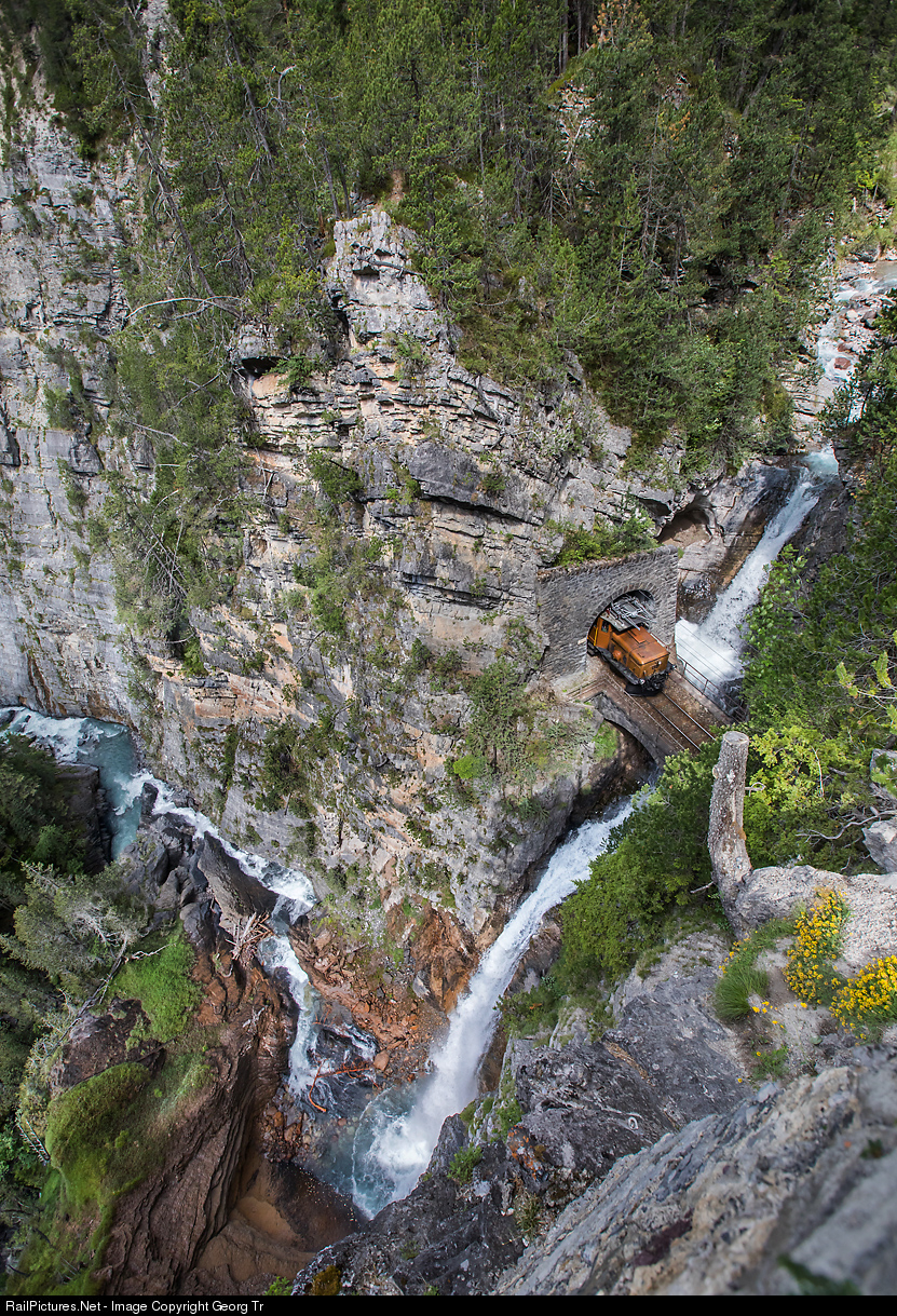 The "Rhaetian Crocodile" stretches its brown nose out of the 450 metre long Wiesen I tunnel. The bridge over the Brückentobel stream is only 10 metres long and leads directly into the 968 metre long Bärentritttunnel. The Brückentobel stream falls as a waterfall into the Landwasser river coming from Davos. The Ge 6/6 I # 414 pulls the nostalgia train "Zügenschlucht" from Filisur to Davos Platz. The train runs twice daily in each direction during the whole summer until October 28th.