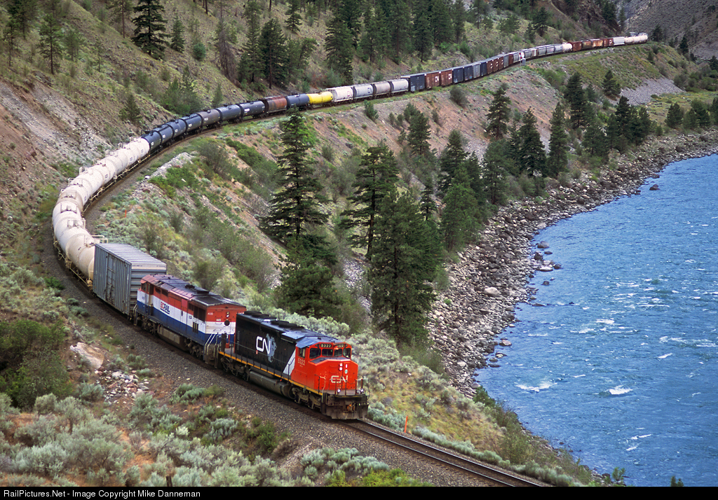 Canadian National GMD SD40-2W No. 5322 and British Columbia Railway GE C40-8Mu No. 4618 power a CN freight eastbound along the Thompson River on Canadian Pacific’s Thompson Subdivision at Drynoch, British Columbia, on July 6, 2004.