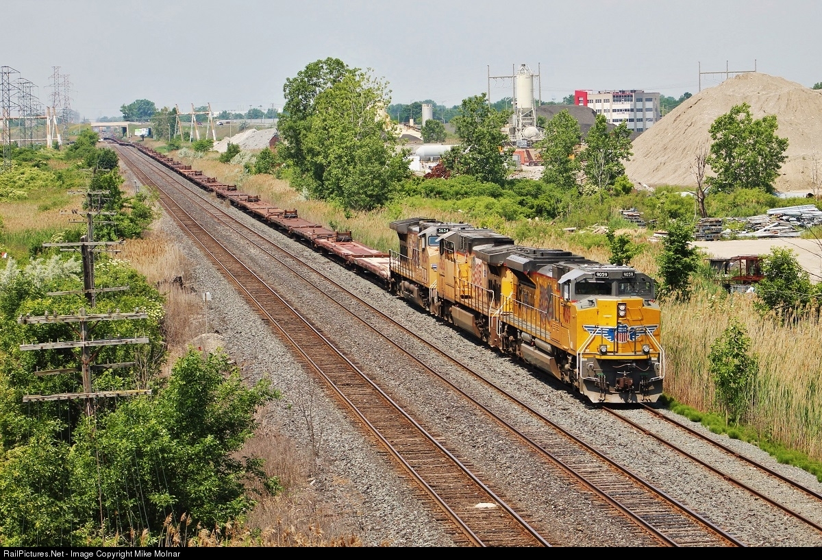 | An empty wind turbine train snakes its way into the old siding track at the east end of Walkerville in Windsor, ON. At a quick glance one could easily mistake this for a UP train! The SD70AH leader is fairly rare here since most crews prefer to swap the American leaders that come across every now and again for a Canadian one which is why most Ontario railfans hate Windsor. All the good power never leads out of here except on rare occasions like these. |