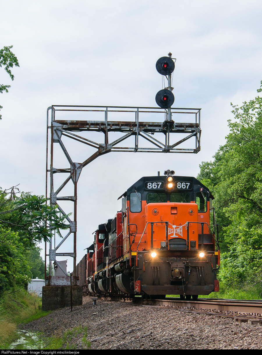 Bessemer & Lake Erie SD38AC 867 leads southbound iron ore as it passes under the classic signal cantilever at KY Junction, where the high and low line through Greenville come together.