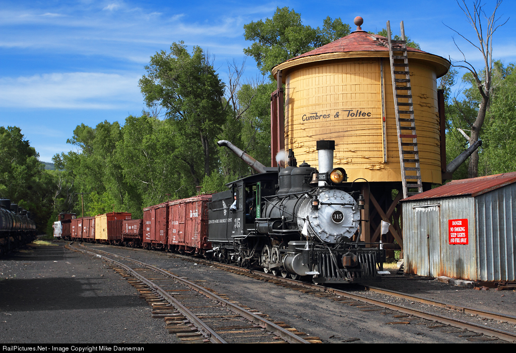 Rio Grande 2-8-0 C-18 No. 315 arrives at Chama, New Mexico, with a 9-car freight on the afternoon of June 5, 2018. The consolidation ran as an extra, following regular Cumbres & Toltec Scenic Railroad passenger train No. 215 all the way from Antonito, Colorado—64 miles over Cumbres Pass. The three cars behind No. 315 were picked up at Cumbres.
