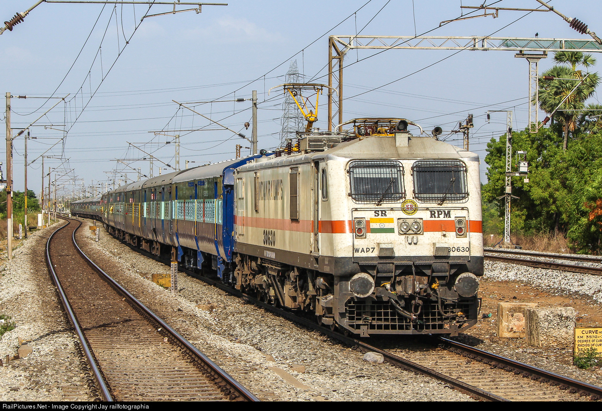 22 carriages with an additional overhauled carriage negotiating curves of Sevvapett Road area with ROYAPURAM WAP-7 in lead