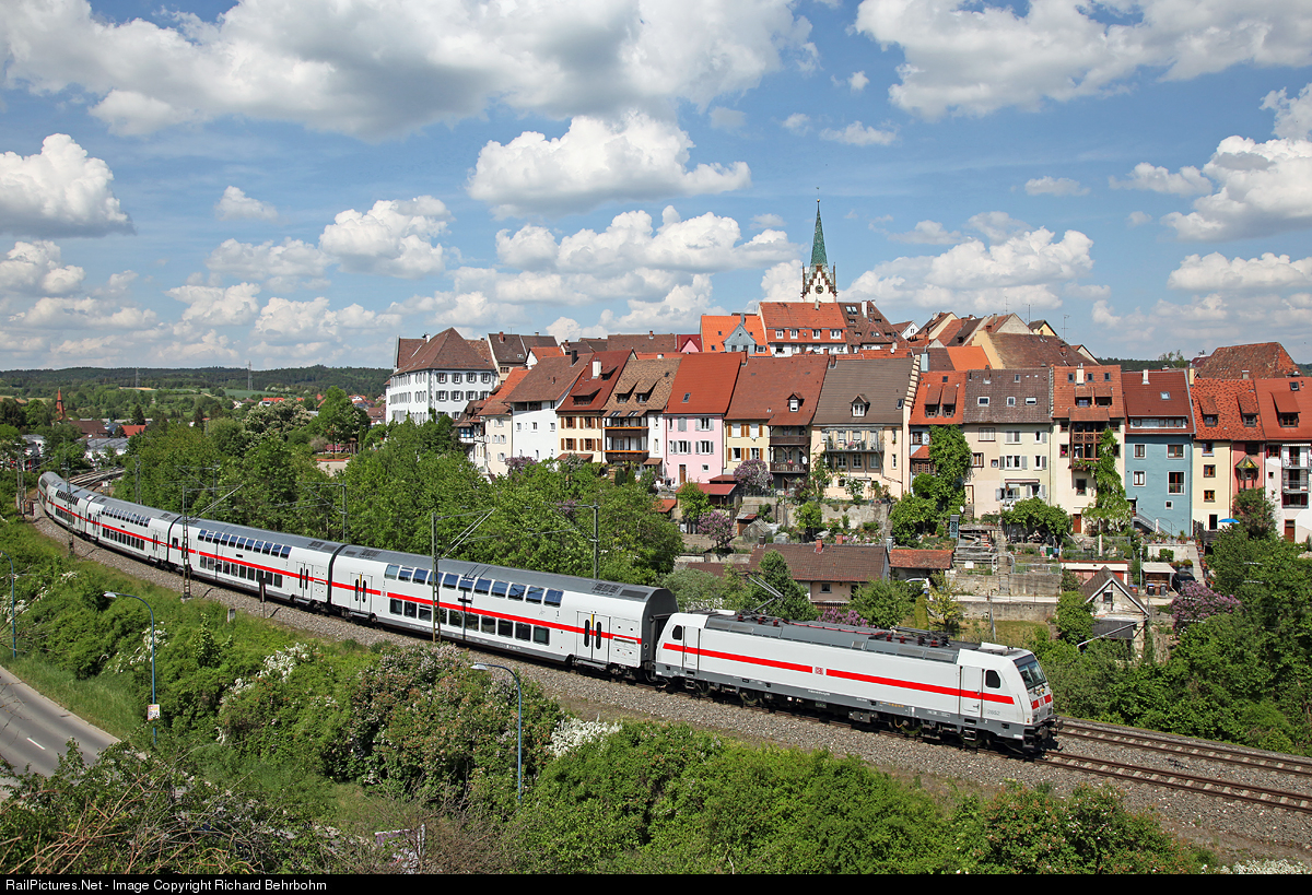 | IC 2 is a push-pull train. On the way Stuttgart – Singen the locomotive is usually pushing. At this day the train was inverted formed and 146 574 was pulling the train along the old city of Engen. |