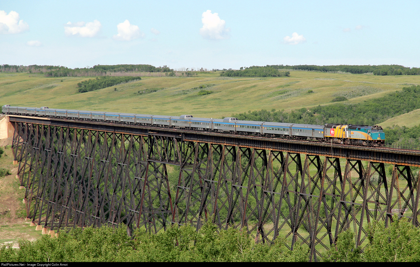A late running eastbound VIA #2 crosses the Battle River Trestle headed by 6426 and a 40th anniversary wrapped 6454.