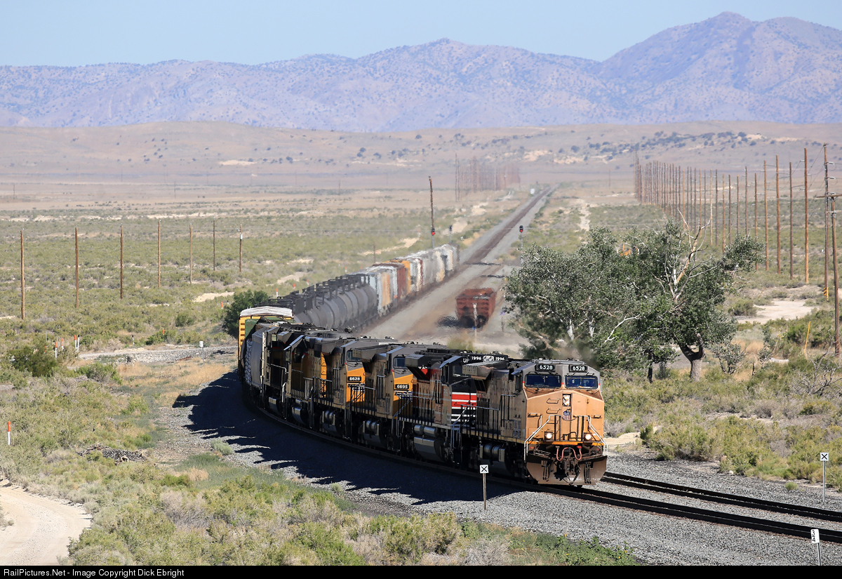 | Eastbound freights are pretty scarce on Union Pacific’s Shafter Sub. in Utah and Nevada. Most eastbounds take the parallel and faster Lakeside Sub., a few miles to the north. The daily manifest train MRVRO is an exception. It is seen here at Delle, Utah, about 40 miles west of Salt Lake City. |
