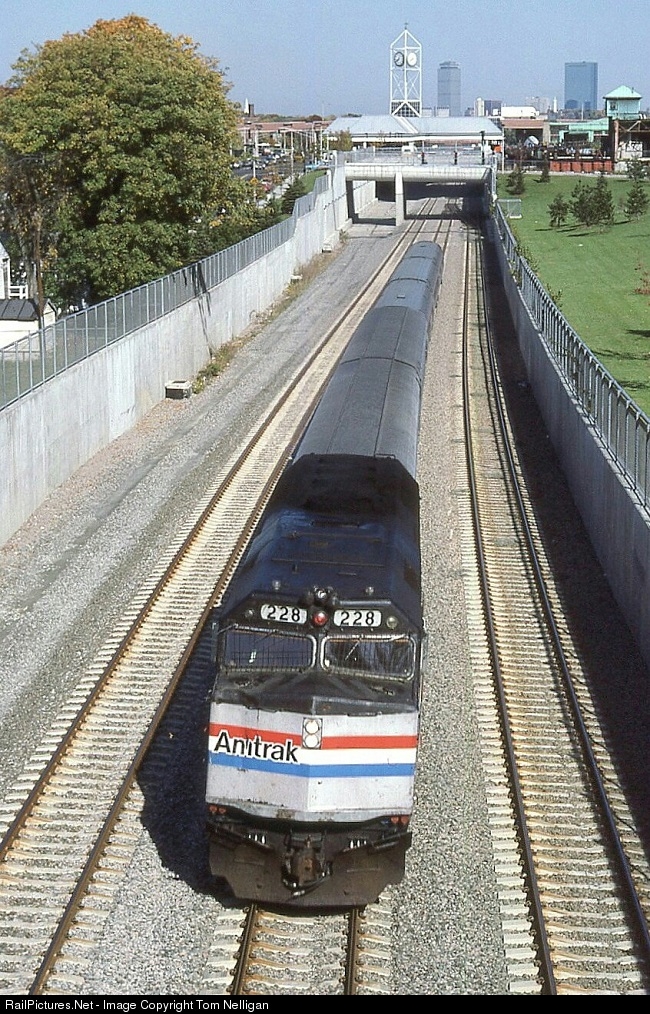 Five miles out of Boston's South Station, Amtrak train 175, the Patriot to Washington, speeds along what was then the newly opened Southwest Corridor depressed right-of-way through Roxbury and Jamaica Plain behind an F40PH. The four-mile-long cut that has carried corridor trains since 1987 replaced a combination of a surface right-of-way and an embankment, both four tracks wide, that had carried the railroad for generations but was regarded by some community groups as a neighborhood divider and eyesore. The Forest Hills transit/commuter rail station is in the background.