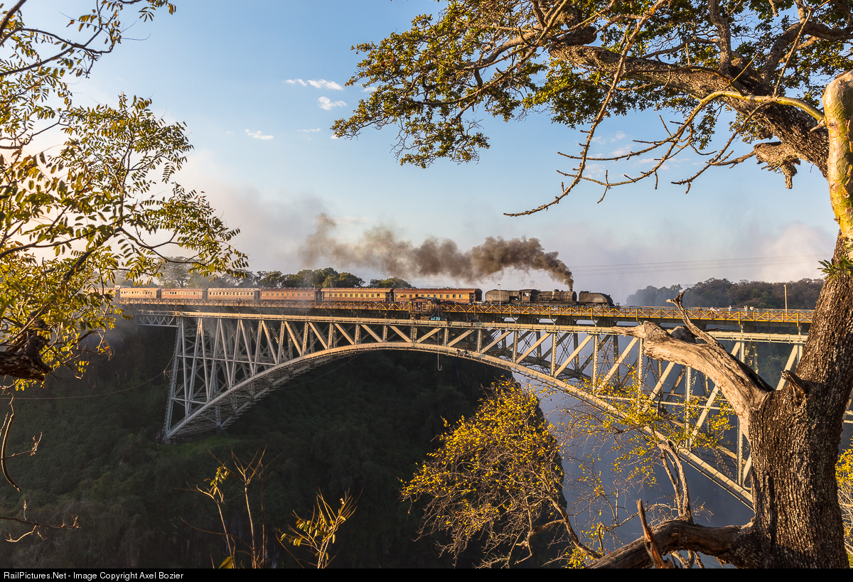 In the last light of the day, a passenger train pulled by NRZ's Garratt Class 15A 4-6-4+4-6-4 steam locomotive #414 "Ubhejane" ("Black Rhinoceros") is crossing THE Victoria Falls Bridge. Sir Cecil Rhodes, Father of the "Cape to Cairo Railway", instructed the engineers to "build the bridge across the Zambezi where the trains, as they pass, will catch the spray of the Falls". This picture was taken from the zambian side.