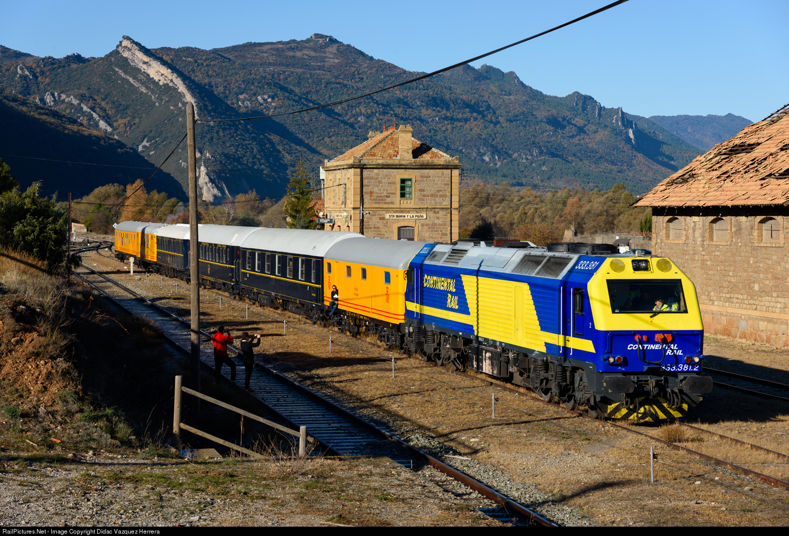 | First passanger train of Continental Rail with 333.381 and the historic train "Tren Azul" (Blue train) of A.Z.A.F.T from Zaragoza Delicias to Canfranc international station. At the photo, train stopped at Santa María y La Peña station, waitning to cross with Regional train to Zaragoza. |
