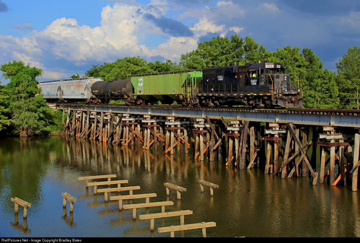 CAGY GP11 #1806 (former IC) leads a Columbus & Greenville Railway Train West as they pass over Roebuck Lake in Itta Bena, MS. Bound for Greenville, MS. With interchange from Canadian National at Greenwood, MS.