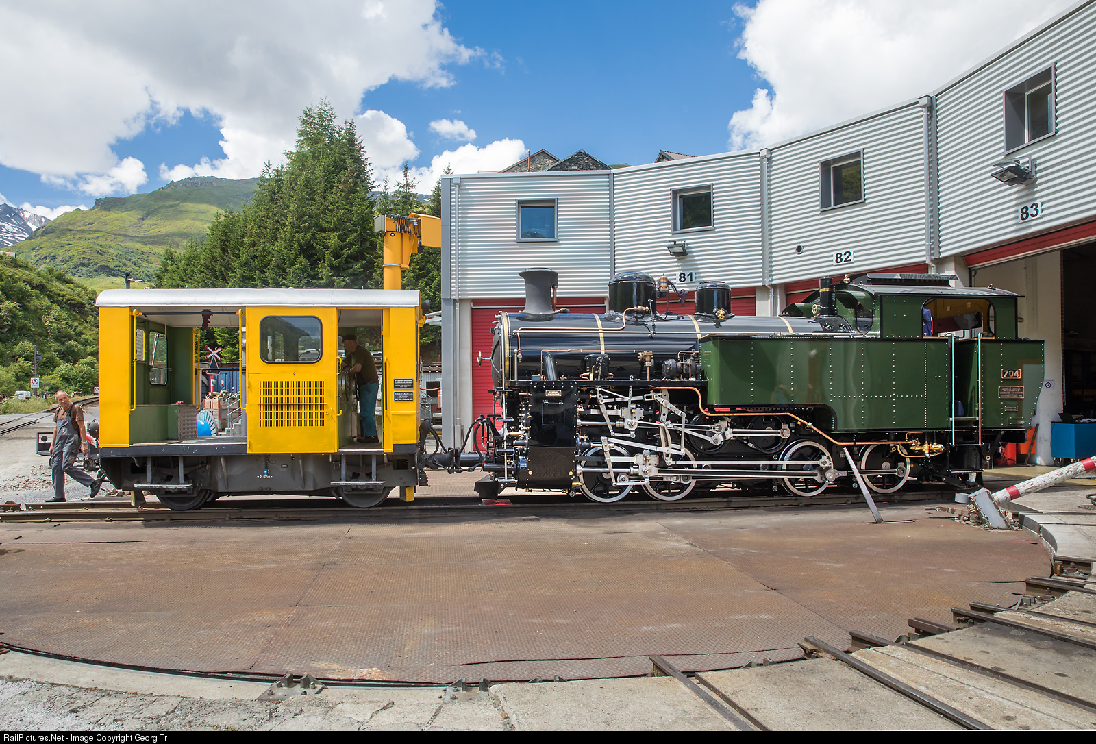 The "new" 0-8-0 cogwheeel steamlocomotive HG 4/4 # 704 of the Dampfbahn Furka Bergstrecke (DFB), built in 1923 by the SLM in Winterthur for Indochina (Vietnam), was just pulled out of the shed at Realp by yellow shunter Tm 2/2 # 91. In a few days, the locomotive will be fired up the first time in Switzerland.