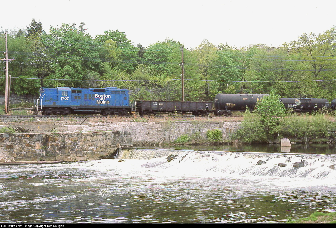With the usual GP9 up front, Boston & Maine train WA-1 parallels the Naugatuck River in Naugatuck, CT, southbound on Metro North's Waterbury branch. At the time this Waterbury-based local served customers as far south as Derby on former New Haven RR trackage.