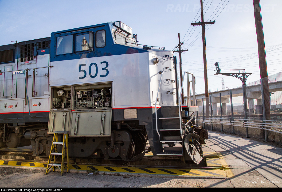 | Having some electrical work done, AMTK 503 finds itself on one of the Redondo turntable's whisker tracks this morning as the ex-ATSF cantilever signal bridge here stands sentinel in the background. |