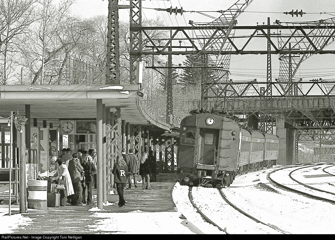 A set of former New Haven Pullman-Standard MUs running as a Penn Central Stamford-Grand Central local swings into the station at Rye, NY, on a winter day. The unique triangular catenary, since replaced, dated to the NH's original electrification in 1907.