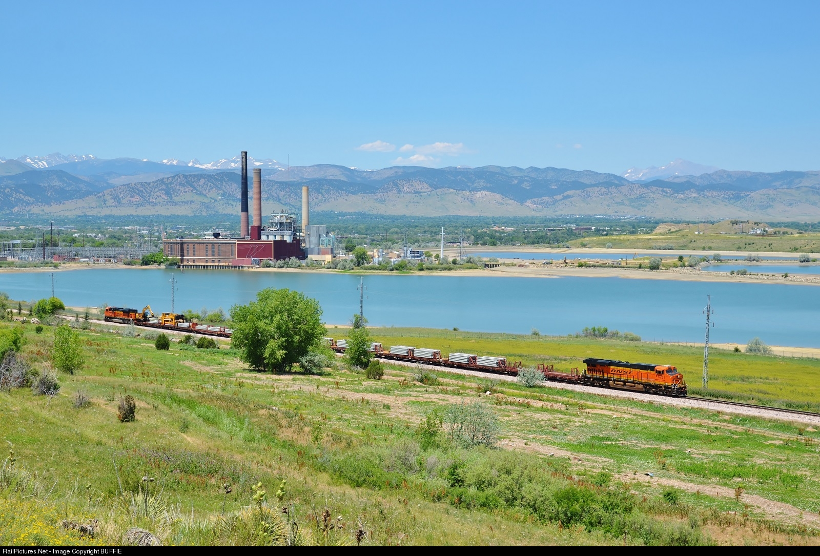 BNSF 6751 (ES44C4) leads a work train that is placing concrete ties along the stretch of track that runs past the Valmont Power Plant in Boulder, Colorado.