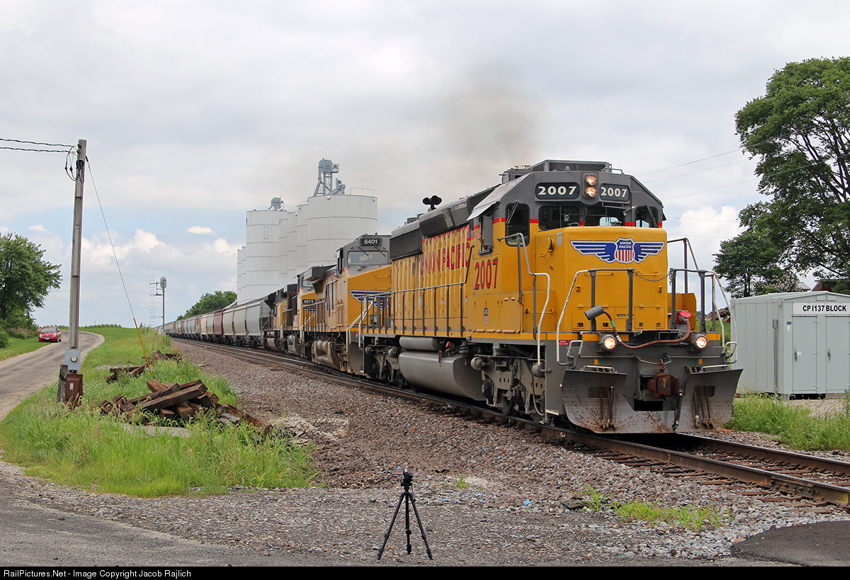 | A UP SD40N has somehow made its way out of the yard and onto the point of this UP grain train, headed south through Block on a beautiful July morning. |