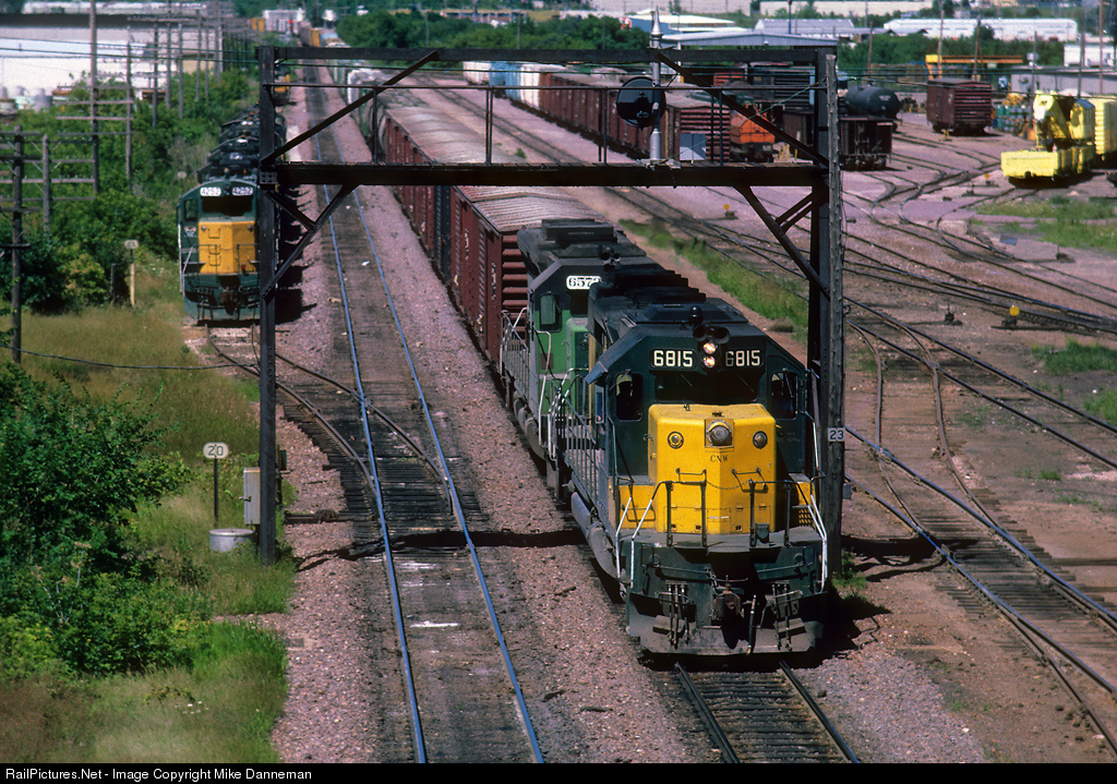 A southbound Chicago & North Western freight passes under a signal bridge approaching the crew change alongside the yard at Butler, Wisconsin, in August 1984. Behind lead EMD SD40-2 No. 6815 is one of a fleet of former BN SD45s that CNW acquired, along with a group of ex-Conrail SD45s, to give a boost to the locomotive roster when the railroad entered Powder River Basin. The locomotives on the left are stored—mostly rebuilt GP7s.