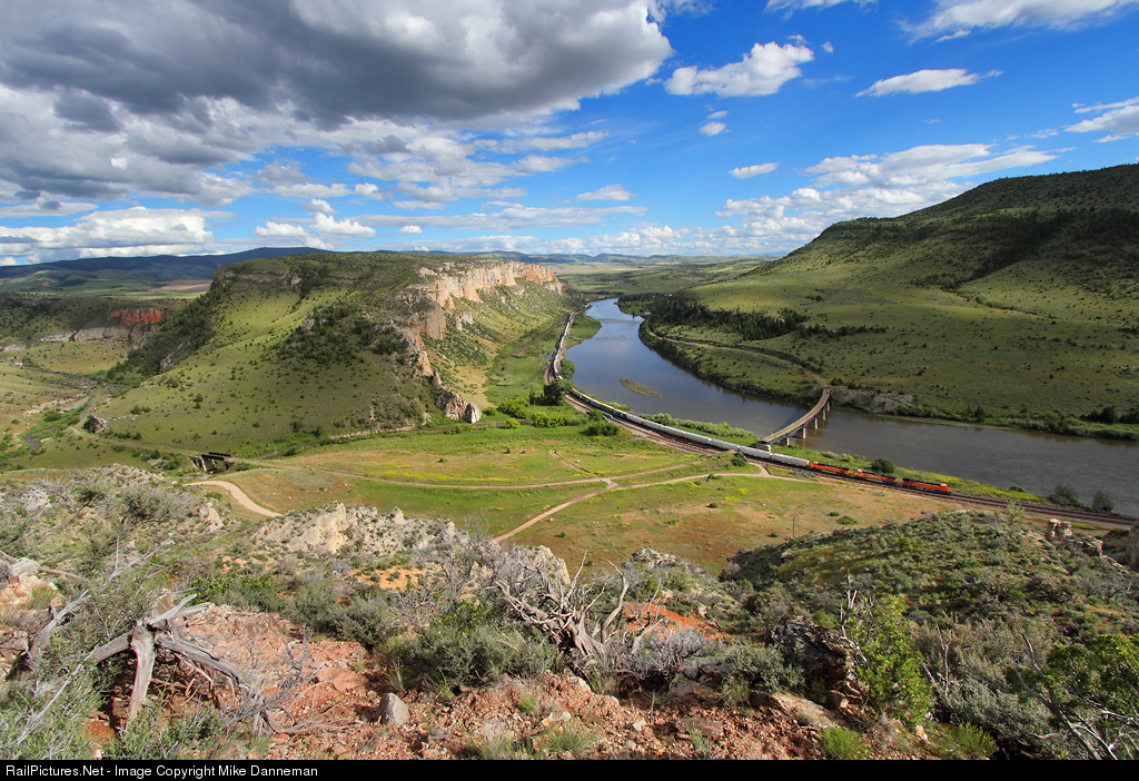 A westbound BNSF manifest freight train curves along the Missouri River past the townsite of Lombard, Montana, on the afternoon of June 30, 2018. The train passing under the abandoned right-of-way of Milwaukee Road’s Pacific Extension main line, which includes a curved bridge over the Missouri River that once also spanned Montana Rail Link’s former NP/BN main line on a now-removed through girder bridge. On the left, an empty Milwaukee Road grade enters Sixteen Mile Canyon heading east.