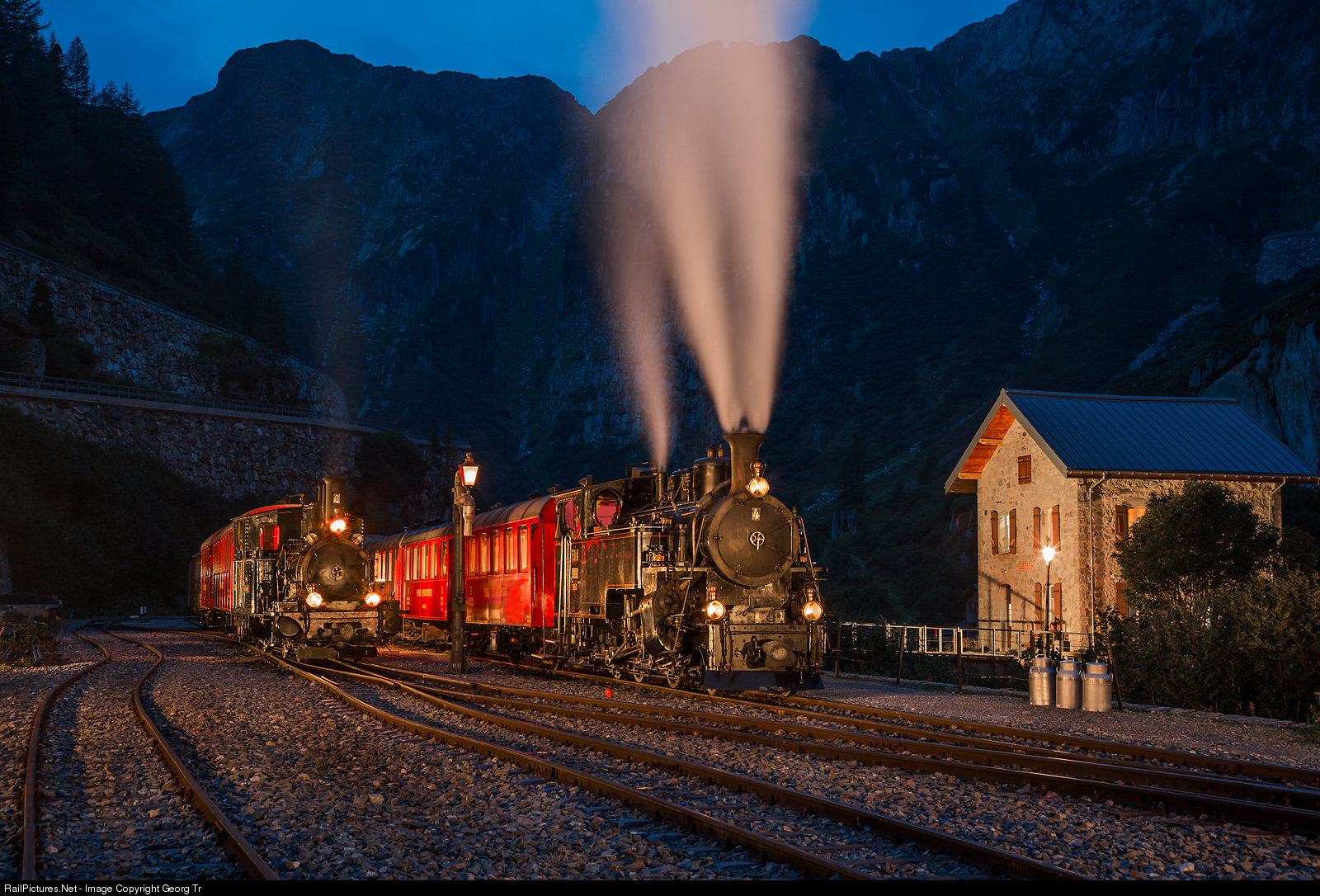 Night has fallen in Gletsch. Two steam trains of the Dampfbahn Furka Bergstrecke (DFB) are in the station, and on the right there are 3 milk cans ready to be loaded. On the left cogwheel steamlocomotive HG 2/3 # 6 "Weisshorn", built in 1902 by SLM Winterthur for the Visp-Zermatt Bahn (VZ), which became later the Brig-Visp-Zermatt (BVZ) and is now part of the Matterhorn-Gotthard Bahn (MGBahn). On the right cogwheel steamlocomotive HG 3/4 # 4 of the former Brig-Furka-Disentis (BFD), then Furka Oberalp Railway (FO), built in 1913 by the SLM Winterthur. This was a privately organised photo charter.