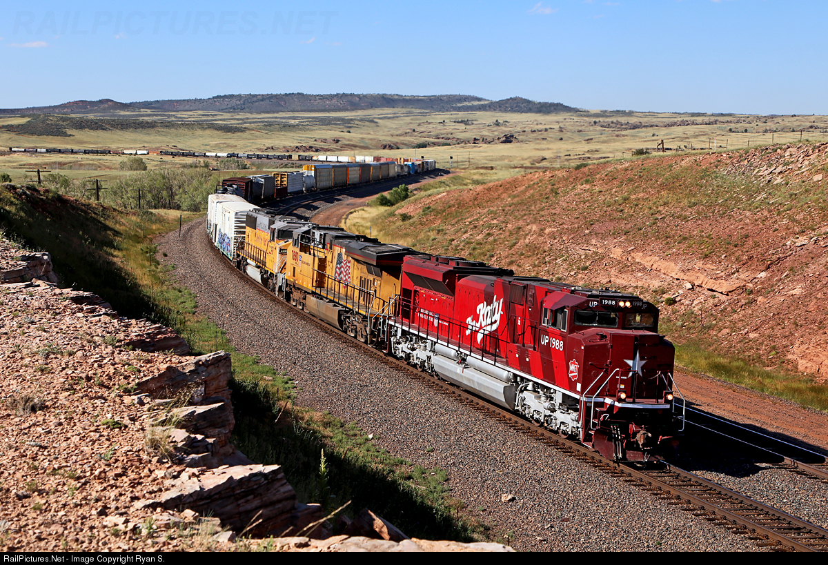 | Conforming to the reverse curves between Heard and Hermosa eastbound tonnage challenges gravity on the climb out of Laramie to the top of Sherman Hill. Nearly 10 miles remain for the eastbound manifest before the 8015' summit will be at hand. UP 1988, Union Pacific's Missouri-Kansas-Texas heritage motor, leads the charge. |