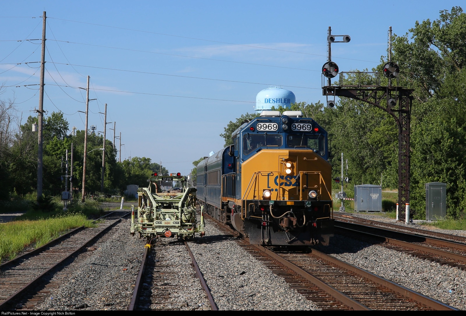 After a lengthy wait north of the diamond to allow congestion between CSX trains D743, K172, Q351, and Q561 to clear up at South Deshler, the southbound Geometry Train gets back on the move through town with the one-of-a-kind CSX GP40WH-2 9969 in the lead. Also note the faded MOW machine and B&O-era cantilever signal.
