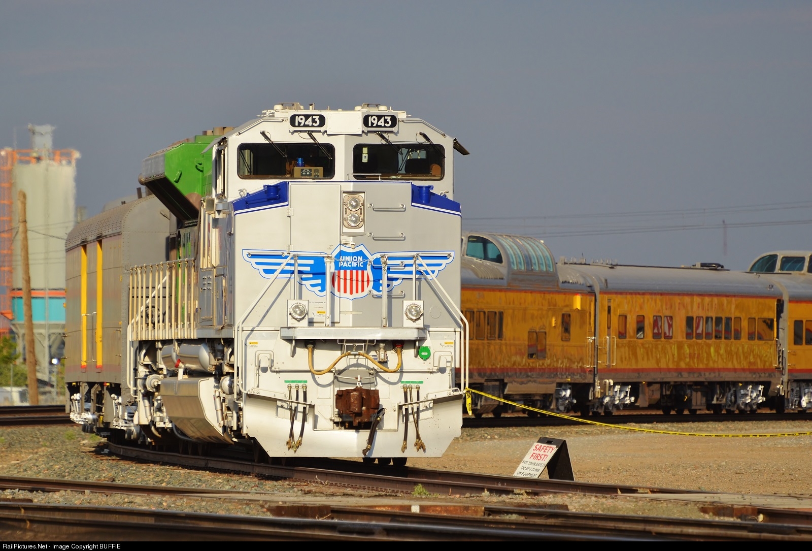 UP 1943 (The Spirit of Union Pacific) sits in the late evening sun waiting for UP 884 to lash up and get set to take passengers on the last Cheyenne Frontier Days train. The Denver Post, which sponsored the annual trek between Denver, Colorado and Cheyenne, Wyoming, has fallen on hard times and has announced this will be the last train sponsored by the paper.