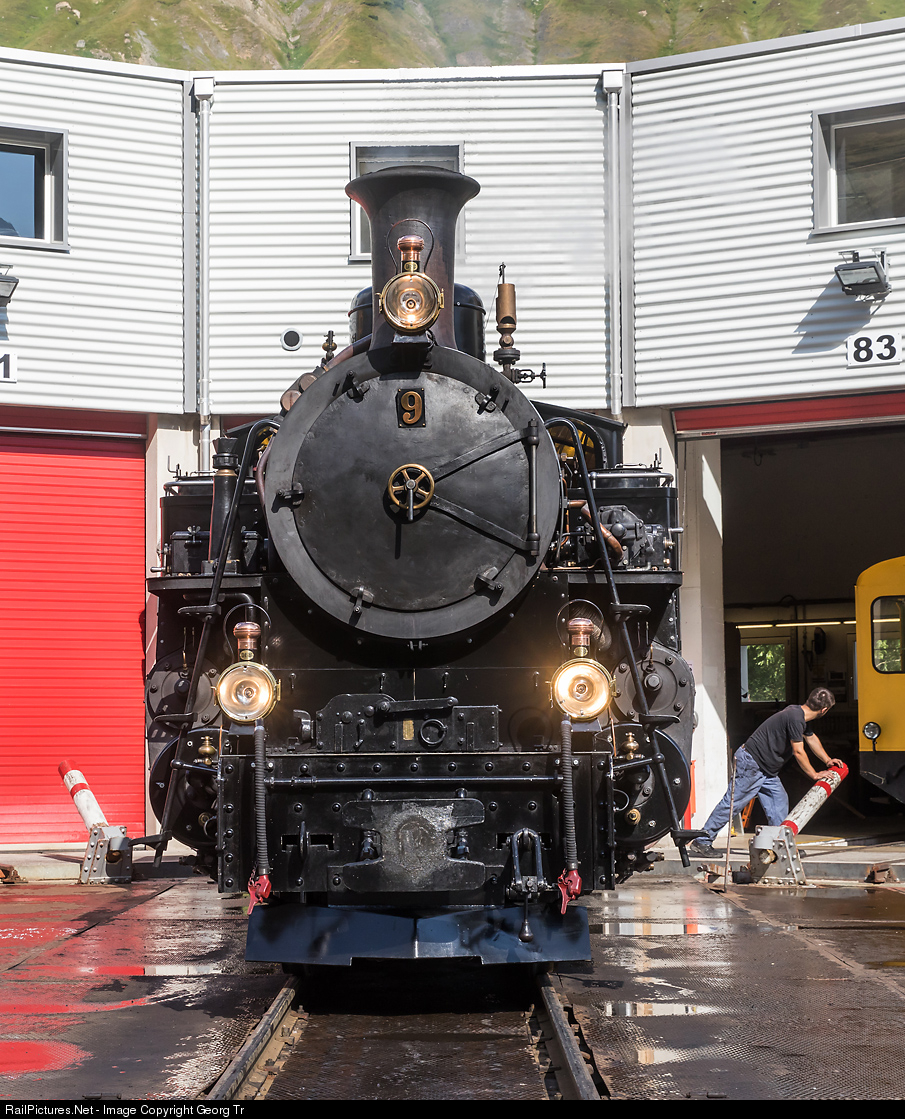 Cogwheel steamlocomotive HG 3/4 # 9 of the Dampfbahn Furka Bergstrecke (DFB) is beeing turned on the turntable of Realp. The 2-6-0 was built in 1914 by the SLM for the Brigue-Furka-Disentis Railway (BFD), ran then for the successor Furka-Oberalp Bahn (FO) and was sold to Vietnam in 1947, after electrification of the FO. Brought back to Switzerland in 1990, revision in Meiningen/Germany in 1993. New large revision by workshop Chur in 2013.