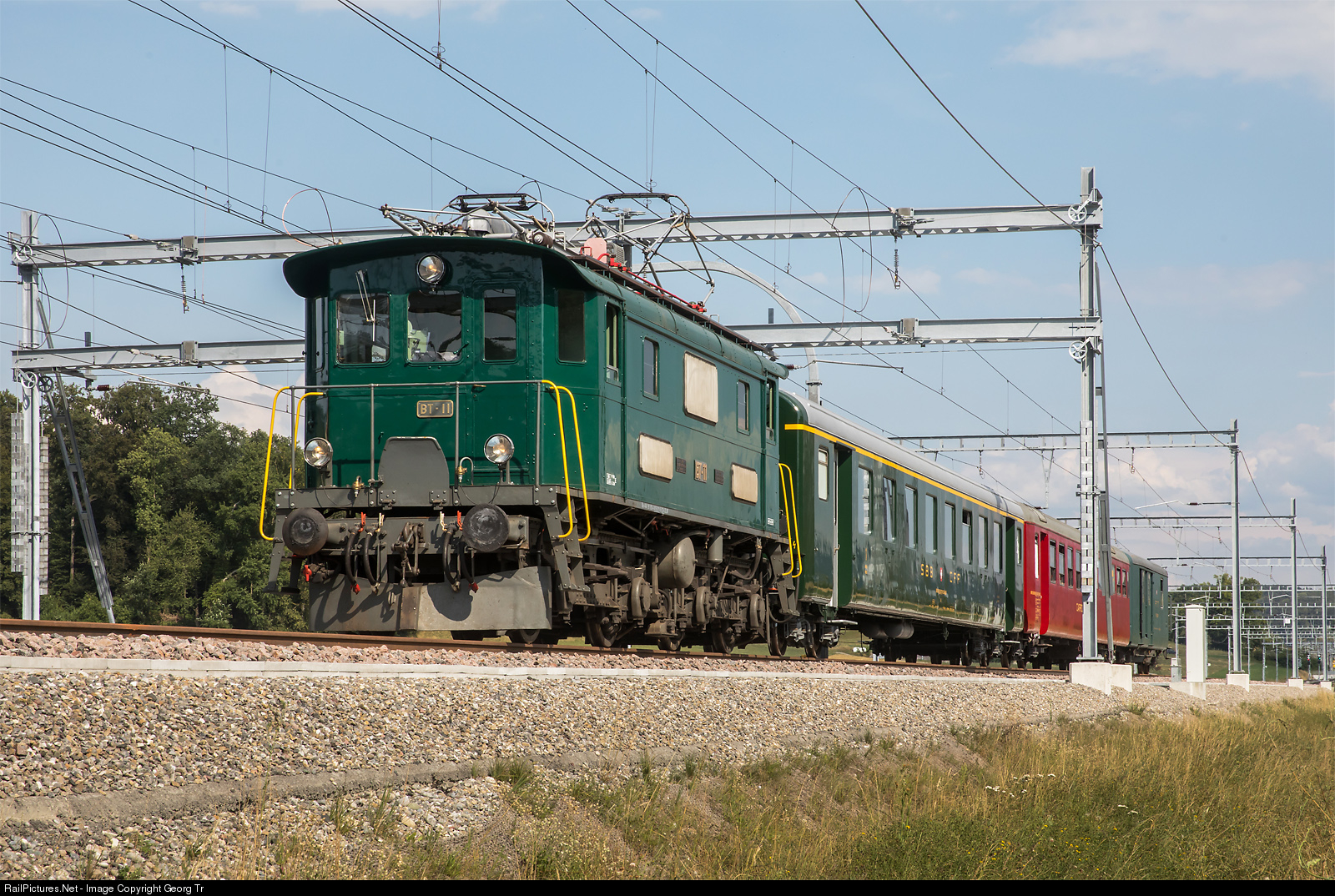 Passenger train of the Schorno Locomotive Management Gmbh from Herisau via St.Gallen GB-Wil to Winterthur, in the new built overtaking station of Schneit, between Elgg and Schottikon. Former Bodensee-Toggenburg-Bahn (BT) locomotive Be 4/4 # 11 from 1931 (SLM/SAAS) is pulling former SBB first class standard car type II # 50 85 18-33 617-9 CH-SLM, former Südostbahn "Gipfeli-Express" dining car WR # 55 85 88-35 452-9 CH-SLM and former mail car Z # 55 85 92-29 609-6 CH-SLM.