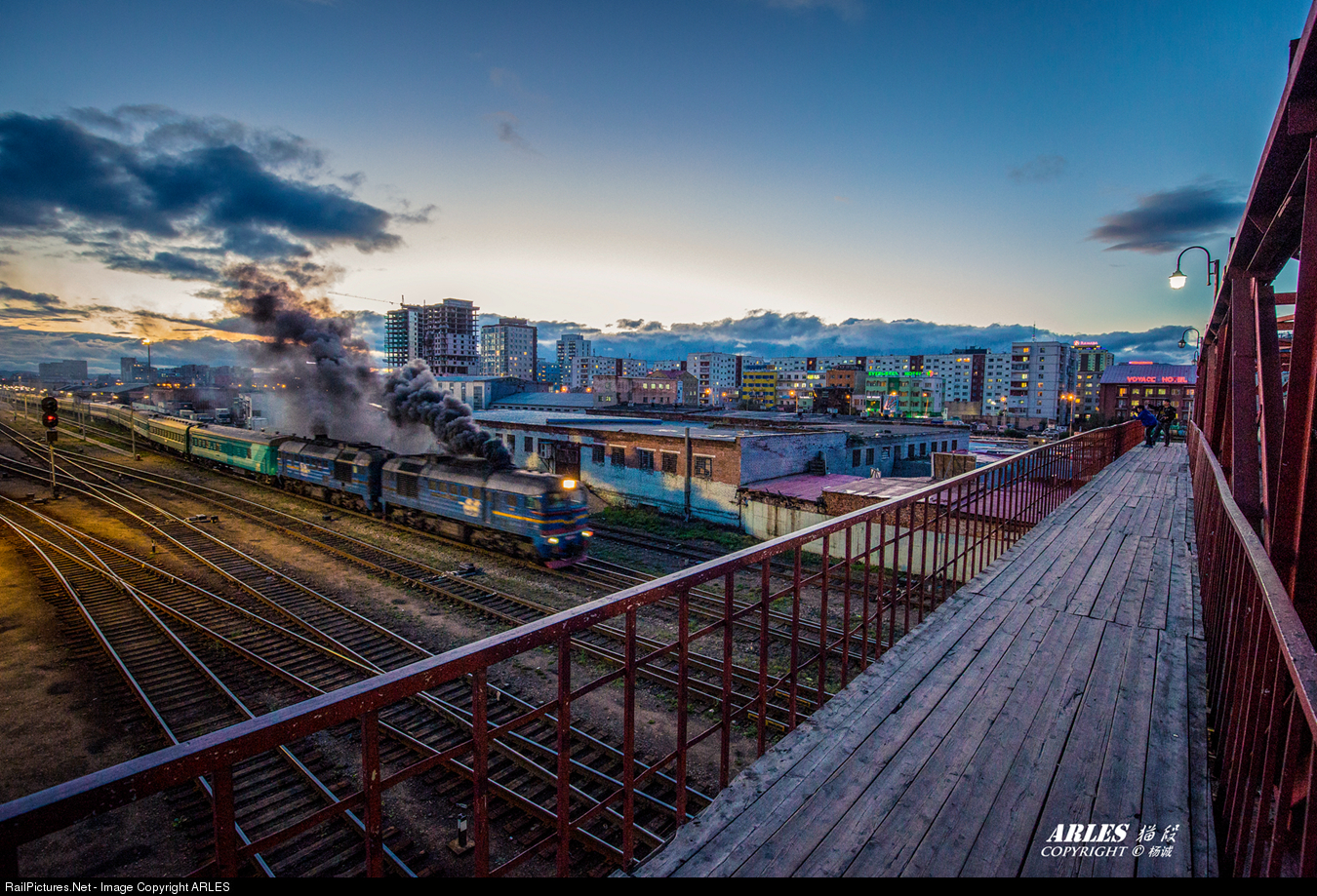 | In the sunset, the train slowly pulled out of Ulan Bator railway station. The M62 locomotive was running madly and spitting smoke. |