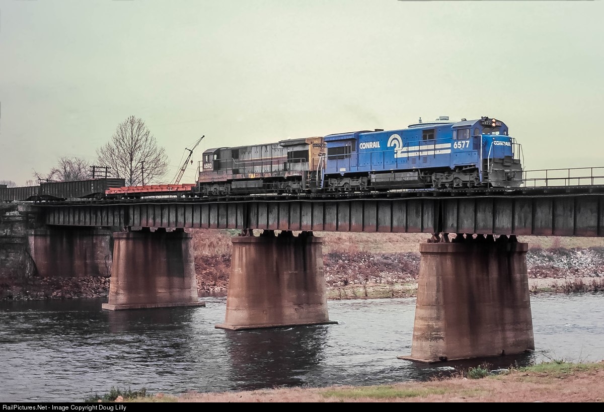One of the staples of Allentown-area train operations before Conrail was Reading train HB8. Operating from Harrisburg (Rutherford) to Bethlehem (actually, Saucon Yard), the train and its return counterpart, BH15, were known locally as the Morning Star and the Afternoon Star, respectively. The symbols and the nicknames lasted a few years into the Conrail era, but the power, of course, did change almost immediately. Reading’s U30C’s did occasionally show up on HB8 and BH15, but they were the exception rather than the rule. Conrail’s roster included U33C’s and U36C’s from the Erie-Lackawanna, and one of each is seen here pulling a 121-car Morning Star across the Lehigh River at Allentown.