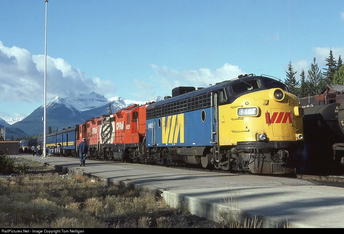 It's a perfect fall day in the Rockies as VIA train #2, the eastbound Canadian, pauses at Banff, Alberta. A pair of CP GP9s are assisting VIA FP7 1402 on its trek through the mountains.