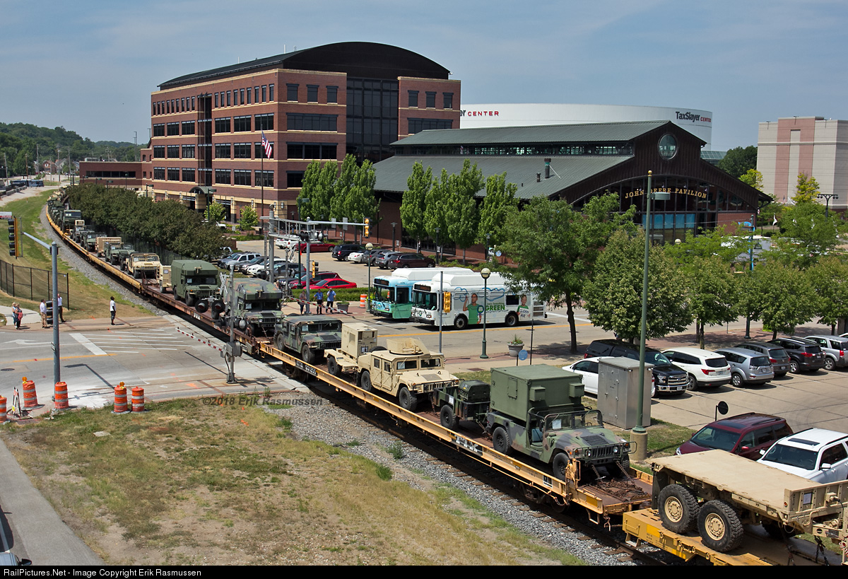 | Iowa Interstate's westbound road freight handles 49 loaded flatcars from the Illinois National Guard. According to the Illinois National Guard Facebook page, the Guard was sending equipment and troops to Fort Polk, LA for month-long training exercises. The equipment was loaded at the Rock Island Arsenal. |