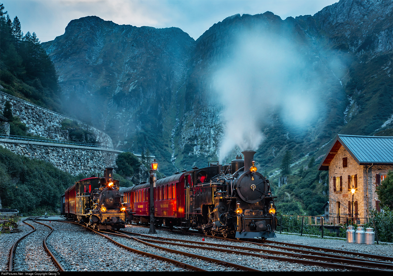 In the "blue hour" at Gletsch, 1762 meter a.s.l., on the foot of the Grimsel and Furka passes. Steamtrains of the Dampfbahn Furka Bergstrecke (DFB), with HG 2/3 # 6 "Weisshorn" on the left and HG 3/4 # 4 on the right. A Markus Fischer/Peter Minder photo tour.