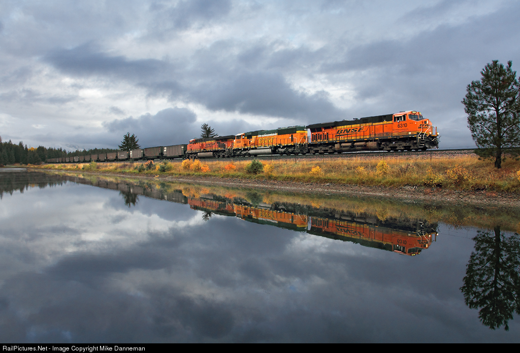| It’s completely calm as an eastbound BNSF coal empty charges by Frog Pond just west of Trout Creek, Montana, on October 13, 2017. |