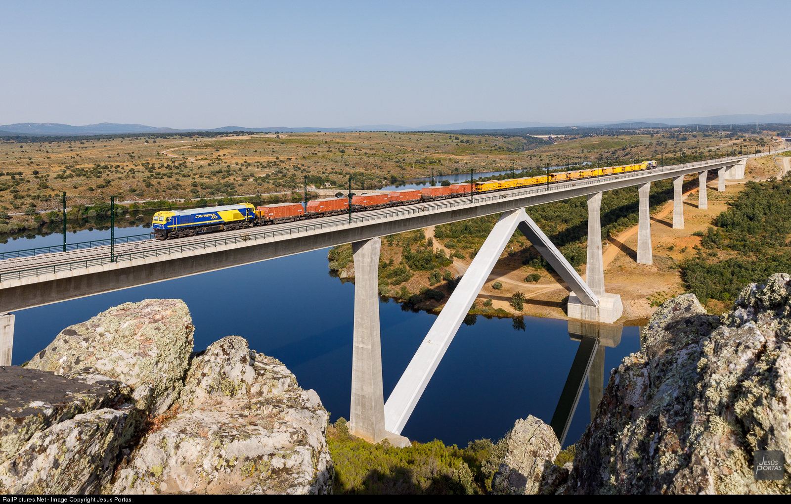 319.306 and 319.222 with a ballast train over Tera river viaduct.