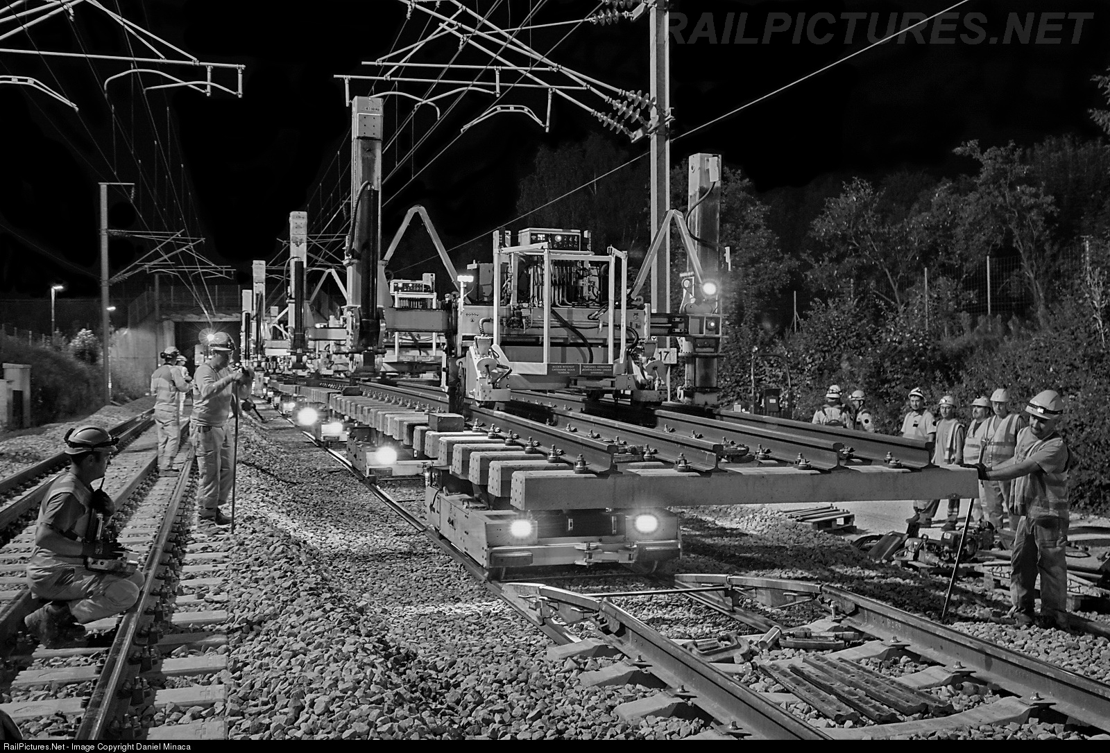 During night works on high speed line track to change a long switch with movable frog point. The machines from above named "Lorrys" carries the complete switch pre-assembled with rails and concrete ties. "Lorrys" are remote controlled trolleys (lower left worker have remote control in hands) where switch ties are placed on, this switch need 11 Lorrys to move the whole on temporary track that you can see under Lorrys. The machines from above are remote controlled gantries which can support the complete switch when Lorrys are removed, and moves right or left to place correctly the switch on ballast after that temporary track have been removed by workers which waiting along the track.