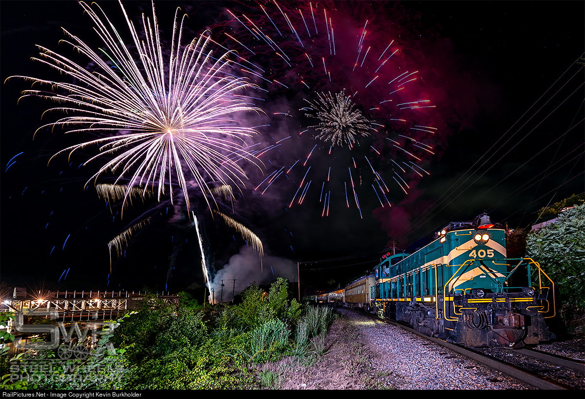 The final scheduled run for Vermont Rail System’s Scott Whitney before his retirement was the annual Old Home Days Fireworks Train in Bellows Falls, VT on the evening of August 4. Beginning his career with the GreenMountain Railroad in 1981, Whitney would go on to become synonymous with the GMRC Alco RS-1 #405, that has been his baby. It was fitting that he would be at the throttle of the GMRC 405 for the 2018 Fireworks Train, as it provided sending him out with a bang! Whitney leans out the window of the 67-year-old Alco as the fireworks commence in Bellows Falls, VT.